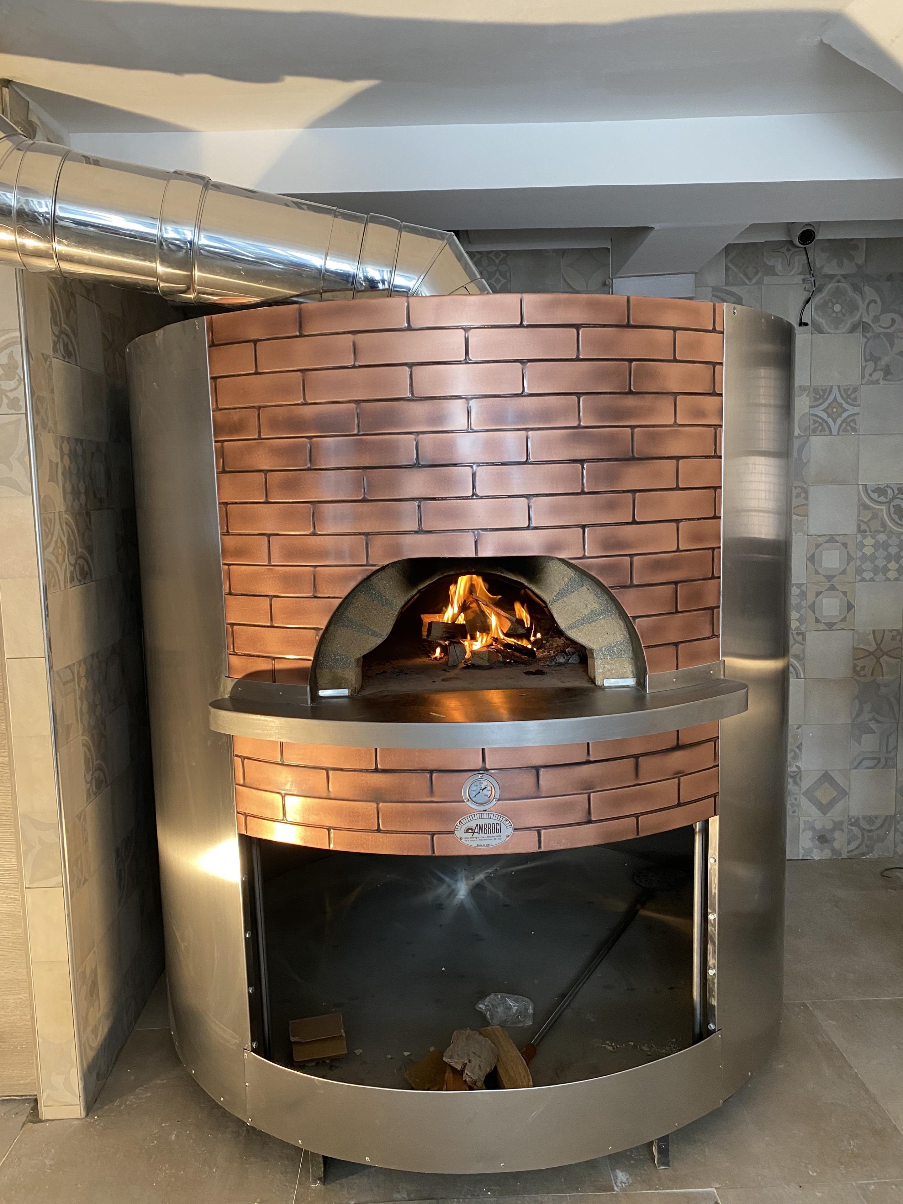 Positionné à la place de l'ancien four, sa forme cylindrique, sa structure externe en acier et ses facades en cuivre apporte un côté moderne à notre pizzéria.